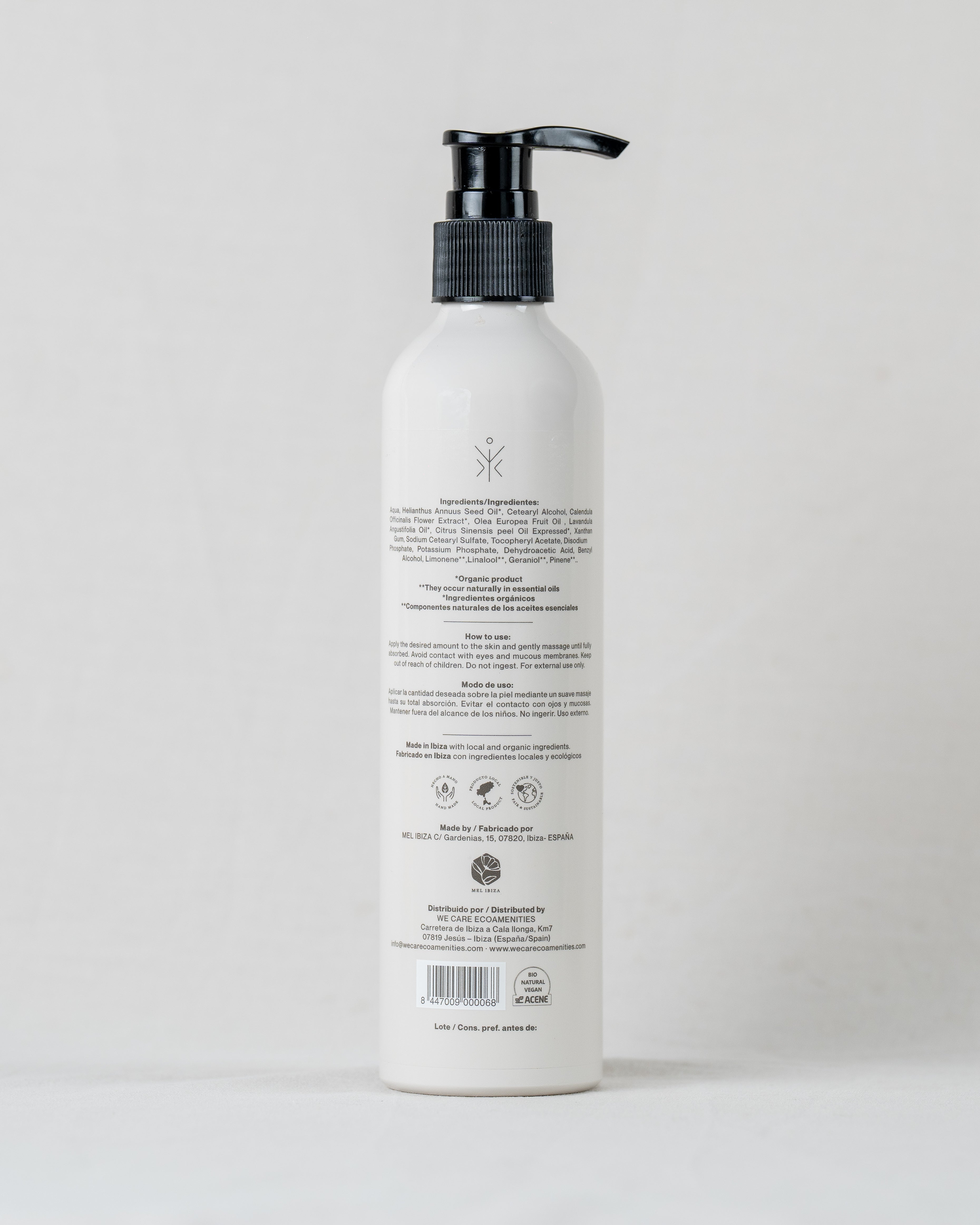 100% ingredientes naturales | 6,4% de ingredientes ecológicos I Producido artesanalmente en Ibiza | Hidratación prolongada | Apto para veganos | Para todo tipo de piel I 300 ml